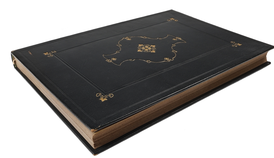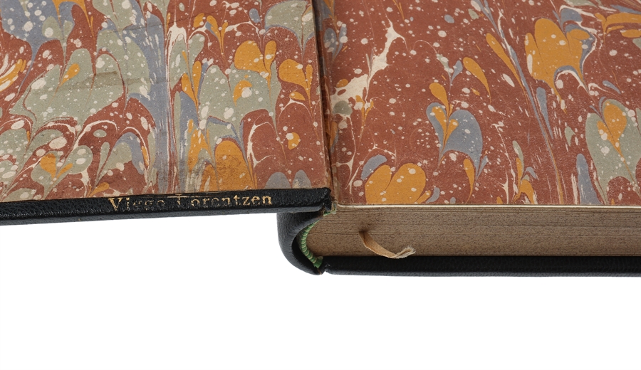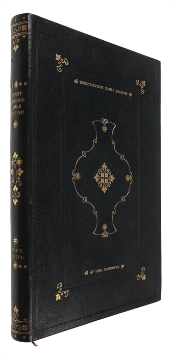 4to. (28 x 19,5 cm.). Veludført helbind i blåsort maroquin. Permerne opdelte i paneler af blindtrykte rammer med store florale hjørnestempler. I midtfeltet en stor vaseformet dekoration optegnet med forgyldte buer og i midten heraf en forgyldt roset. Øverst i midterfeltet er titlen trykt i guld og nederst "Af Emil Hannover", ligeledes i guld. Rig rygforgyldning hvor stemplerne fra permerne er gentaget. Håndsyede kapitælbånd. På forpermens inderside signeret i guld af bogbinderen "Viggo Lorentzen". Bindet kunne være et svendestykke. De forreste tekstsier har en fugtskjold i øverste og nederste margin, angår ikke bindet. Antageligt udført 1910-20.