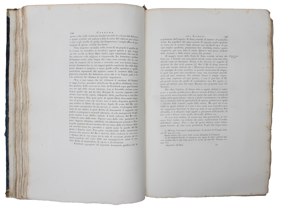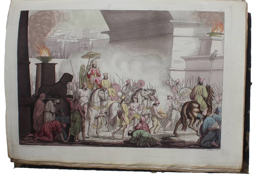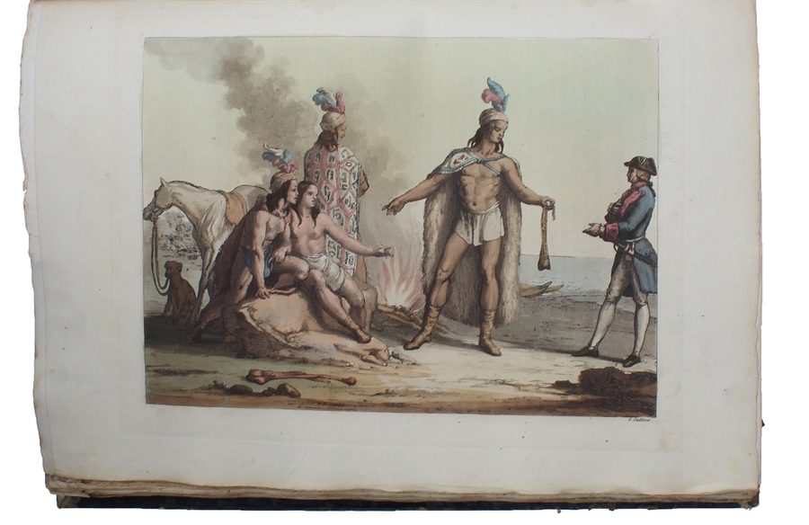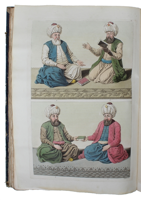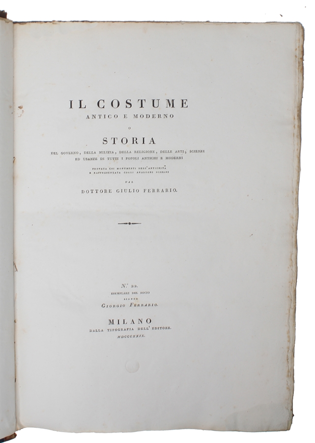 The sumptuous luxury edition with numbered copies, printed on velin with "del socio Signor Giorgio Ferrario" printed on title-pages, of Ferrario’s monumental and extraordinary pictorial encyclopedia of world culture with magnificent hand-coloured aquatint plates depicting costumes, artifacts, scenic views, buildings, ruins, animals and plants from all over the world. The work was published several times, in both French and Italian and in various formats. However, the present publication constitute by far the most lavish and extensive edition, here with the three supplement volumes (Aggiunte) and one register volume (Indice Generale) - all four volumes complete - with much new material on Asia, India, the Pacific, Africa, Ancient Egypt, Europe and the Americas. Born in Milan in 1767, Ferrario was an erudite ecclesiastic charged with the direction of the Biblioteca Braidense, the main public library in the city. "The historical context in which ‘Il costume antico e moderno’ is that of the aftermatch of the French Revolution, the formation of Napoleon’s Empire, and the Habsburg takeover of parts of it, namely the kingdom of Italy and Illyria, within the transformations affecting the Ottoman Empire and its European regions due to the Russian Empire’s aggressive military policy. Ferrario lived through Napoleon’s reign in Italy, including its demise in 1814. He then became a faithful subject of the Austrian monarchy and dedicated his major work to the Habsburg Emperor Francis I. He died in Milan in 1847." (Calvi, Translating Imperial Practices, Knowledge, and Taste Across the Mediterranean: Giulio Ferrario and Ignatius Mouradgea d’Ohsson). “A sophisticated philologist and cultural entrepreneur, Ferrario used his intellectual activity and public persona to acquire a meaningful position in the urban cultural milieu of Milan, the capital of the kingdom of Italy under Napoleon Bonaparte. Charged with different responsibilities in this lieu du savoir for over forty years, Ferrario used the extensive collections of the Biblioteca Braidense to gather a group of scholars and artists around his initiative. These contemporaries shared similar cultural and aesthetic concerns, and contributed to this first major collection of Italian literary classics in 242 volumes.” (Vintila-Ghitulescu, Women, Consumption, and the Circulation of Ideas in South-Eastern Europe). He edited the present work to be a collection aimed at popularizing knowledge of exotic and foreign cultures in an encyclopedic format using a blend of erudition and entertainment. Acknowledging the support of many public and private libraries, scholars, scientists, and art collectors, Ferrario explains his methodology: “We have concentrated in a single work sources that were disseminated in rare and extremely expensive volumes, for our young students to benefit from […]. We hope that the fine arts will also profit from our work, as artists will no longer have to search in vain for the ideal costumes.”. “Funding for the project was obtained through public subscription. Emperor Francis I, whose name was followed by thirteen members of the European royalty and high nobility. All customers could choose hand-coloured and black and white editions. Subscriptions were made by numerous public libraries in Italy, as well as in cities such as Berlin, Leipzig, London, Mannheim, Munich, Paris, St. Petersburg, and Vienna. Among individual subscribers , there were book sellers, printers, merchants, traders, painters, engravers, states employees and eccleastics. ____________________________ THE SET CONSISTS OF THE FOLLOWING: AFRICA, (2 vols): - Africa, Primo parte. No. 22. 480 pp + 43 hand coloured plates (out of a total of 77 plantes. Wanting: IV, XIII, XXI, XXIX, XXXI, XXXIV, XXXVII, XXXVIII, XXXIX, XL, XLI, XLV, XLVI, XLVII, XLVIII, LI, LIII, LV, LVI, LXI, LXIII, LXV, LXVIII, LXIX, LXXI, LXXII, LXXIII, LXXIV, LXXV, LXXVI, LXXVII). - Africa, Secondo parte. No 15. 543, (1) pp + 83 coloured plates (complete). AMERICA (2 vols - Complete) - Dell’America. Parte Prima. America Settentrionale. No. 17. (1829). 638, (1) + 87 hand coloured plates (complete) - (7) Dell’America. Parte Seconda. America Meridionale. No. 22. 560 pp. + 80 hand coloured plates (complete) ASIA (4 parts in 5 volumes) - Dell’Asia. Volume Primo. No. 22. XXVI, (2), 468 pp. + 62 hand coloured plates (out of a total of 87, wanting the following: XIV, XV, XVIII, XIX, XXII, XXVIII, XXX, XXXVII, XXXVIII, LIII, LXII, LXIV, LXV, LXVI,LXVII, LXXI, LXII,LXXIX, LXXX, LXXXII, LXXXIII, LXXXVII) - Dell’Asia. Volume Secondo, Parte Prima. 313 pp. + 62 Hand Coloured plates. - Dell’Asia. Descrizione delle Isole Ceilan, Maldive e Lachedive, Volume Secondo, Parte Seconda. Pp. 315-600 + 29 hand coloured plates (Complete). - Dell’Asia. Volume Terzo. De Fenicj, De Siri, Degli Arabi. No. 40. 615, (1) pp. + 61 hand coloured plates (Out of a total of 75: Wanting: VI, XXI, LII, LIII, LVIII, LXII, LXIV, LXV, LXVII, LXIX, LXX, LXXII. LXXIII, LXXIV. - Dell’Asia. Volume Quatro. No. 40. 610, (1) pp. + 97 hand coloured plates. (Complete). - Dell’Europa. Volume Primo, Parte Prima + Appendice. No. 15. 572, 43 pp. + 83 hand coloured plates. (Out of a total of 90, wanting: II, XXXIV, XLIX, L, LXXIII LXXXVIII, LXXXIX) - Dell’Europa. Volume Primo, Parte Seconda. No. 17. (4), 573-1109, (3), 19 pp. + 11 hand coloured plates (out of a total of 65. Wanting: XCII, XCIII, XCIV, XCV, XCVI, XCVII, XCVIII,XCIX, CII, CIII, CVI, CVIII, CIX, CX, CXI, CXII, CXIV, CXV, CXVI, CXVII, CXVIII, CXIX, CXX, CXXI,CXXII, CXXIII, CXXIV, CXXV, CXXVI, CXXVII, CXXVIII, CXXIX, CXXX, CXXXI, CXXXII,CXXXIII, CXXXV,CXXXVI, CXXXVII, CXXXIX, CXXXIX, CXXXIX, CXL, CXLIV, CXIV,CXLVI, CXLVII, CXLVIII, CXLIX, CL, CLI,) - Dell’Europa. Volume Primo, Parte Terza. No. 15. 447, (1) pp. + 70 hand coloured plates (complete). - Dell’Europa. Volume Secondo. 604 pp. 107 hand coloured plates (complete). - Dell’Europa. Volume Terzo, Par