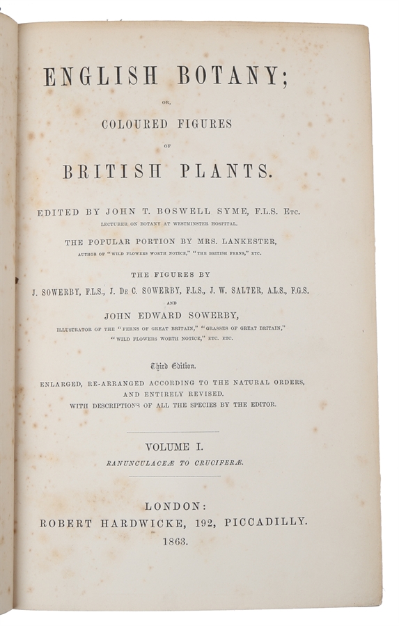 English Botany; or Coloured Figures of British Plants. Edited by John T. Boswell Syme. The Popular Portion by Mrs. Lankester. The Figures by J. Sowerby, J. de C. Sowerby, J.W. Salter. Third Edition. Enlarged, re-arranged according to Natural Orders, and entirely revised with Descriptions of all the Species by the Author. Vol. 1-11 (of 13).