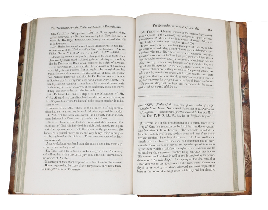 The volume contains another notable paper by GIDEON MANTELL "Notice of the discovery of the remains of the Iguanodon in the Lower Green Sand Formation of the South-east of England. Communcated for this Journal. Pp. 355-360, textillustrations in woodcut.