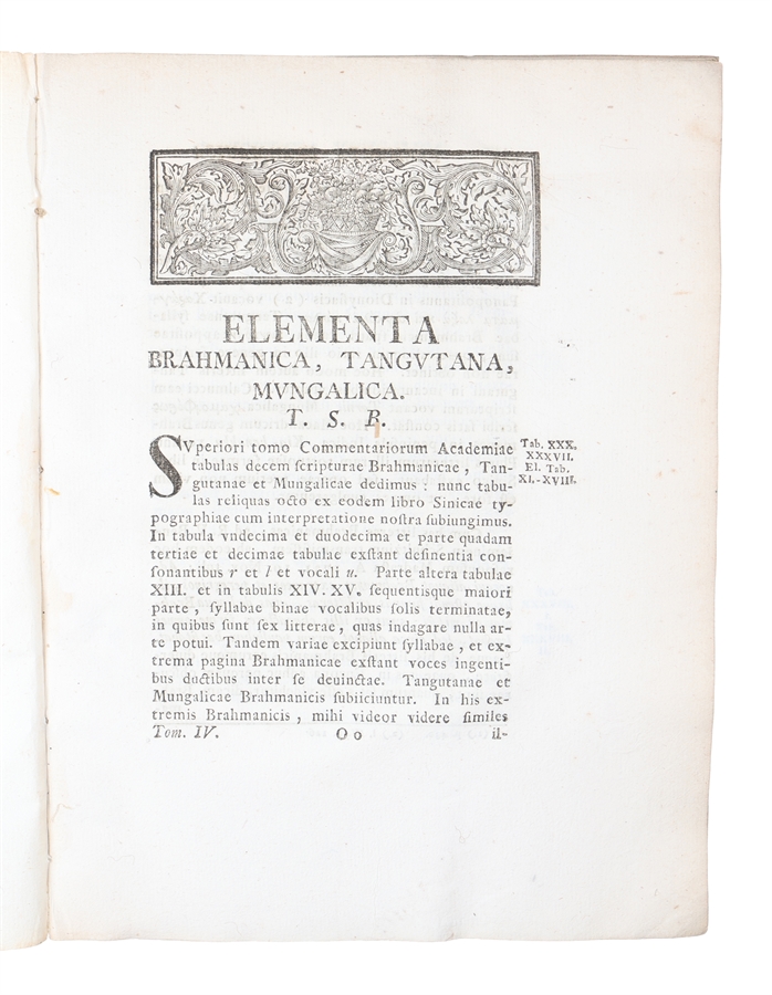 4to. No wrappers. In: "Classes Tertia continens Historica. Commentarii Academiae Scientiarum Imperialis Petropolitanae", Tomus IV ad Annum 1729. The whole section of "Historica"offered. (2) pp. (title to the section),(100)pp. Baye's paper: (23) pp. (wrongly paginated) and 10 engraved plates with numerous, characters, letters etc.
