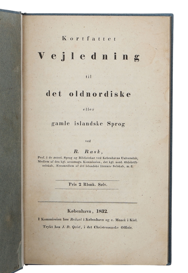 First edition of Rask's short introduction to Old Norse. Rasmus Rask is one of the absolutely most prominent and famous Danish philologers and is very well esteemed worldwide. He was the first to systematically study the ancient Nordic languages and is the discoverer of the relations between the consonants in the Indo-European languages. This discovery served as the foundation of the rules Jacob Grimm later formulated, underlying the Germanic and High-German soundshifts. In PMM Rask is yielded as "one of the founders of the modern science of language." (PMM 266). Hjelmslev I, 197.