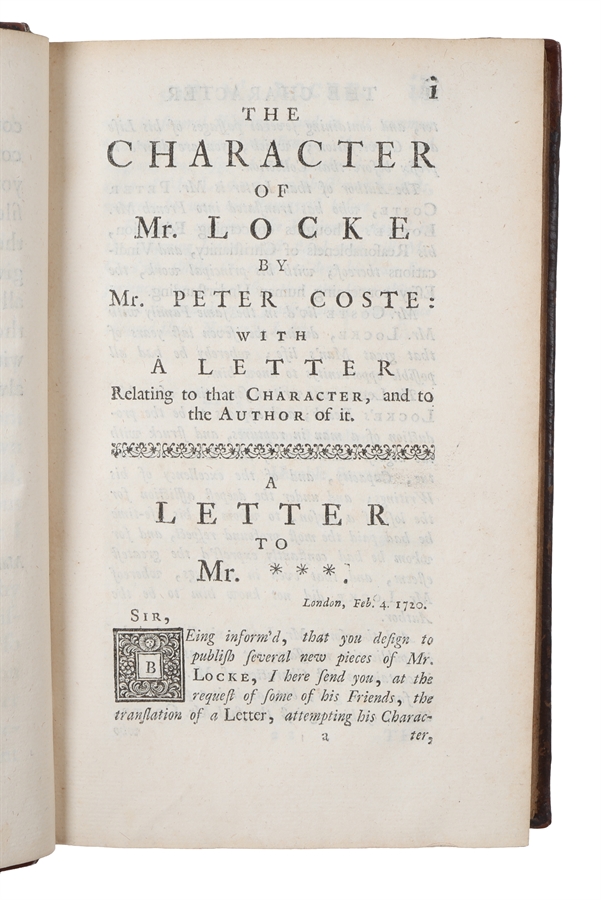 The present "Collection of several Pieces" furthermore included a collection of letters from Locke to Anthony Collins, "Remarks upon some of Mr. Norris's Books...", "Some Thoughts concerning Reading and Study for a Gentleman...", and "Rules of a society...", all printed here for the first time, as well as an English translation of Coste's Eulogy ("The Character of Mr. Locke", originally published in French in 1705), and reprints of "The fundamental Constitutions of Carolina" and "A Letter from a person of Quality...".