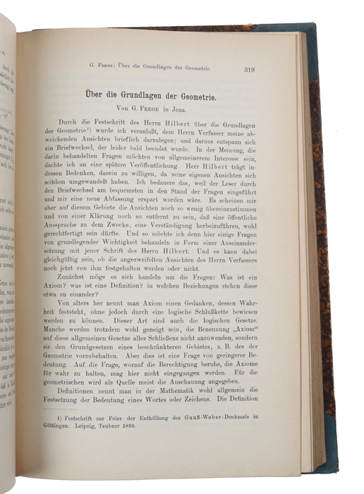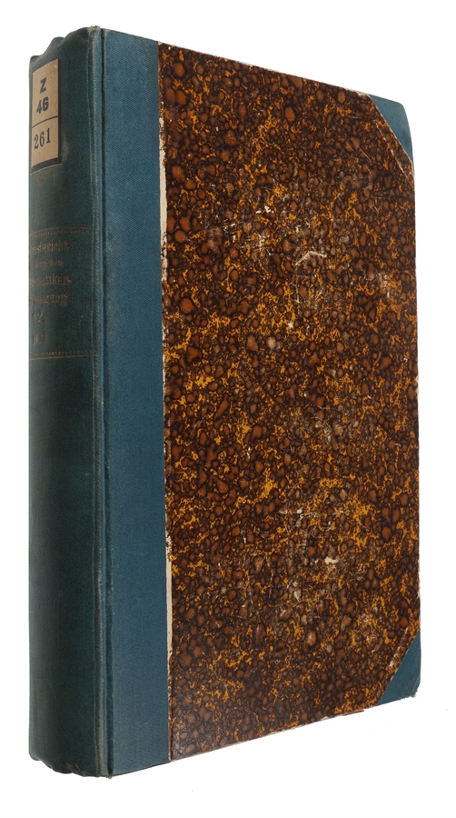 8vo. Bound with the original wrappers in contemporary half cloth with gilt lettering to spine. In "Jahresbericht der Deutschen Mathematiker-Vereinigung", 12. Band. 6. Heft. Juni. Bound with all issues from December 1902 till December 1903 (all issues with wrappers). Pp. 319-324; Pp. 368-375. [Entire volume: VI, 602 pp.].