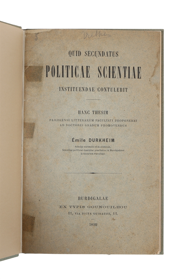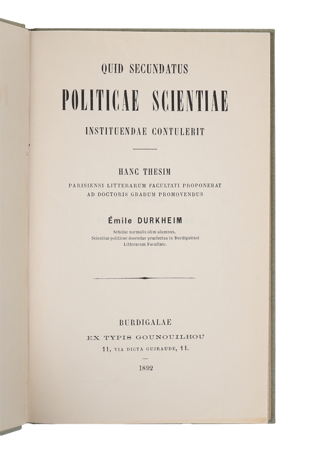 The scarce first edition of Durkheim's earliest published work, his subsidiary Latin thesis on Montesquieu, which anticipates many of his most important theories and contains important observations that are formative for his later work. As such, the present work constitutes his earliest exposition of sociology as a science.