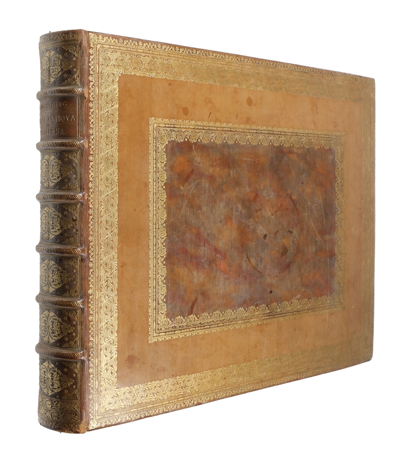 A magnificent fully complete copy in a lavish masterly bookbinding by Gustav Hedberg of the largest and perhaps most sumptuous Scandinavian topographical work. ‘Suecia antiqua’ was an ambitious effort to document Sweden. The kingdom was then at the height of an aggressive expansion and very much aware that it had become a major power, primarily through its success in the Thirty Years War (1618-48) and campaigns against Denmark and Poland in the 1650’ies. In the course of this transformation, it took substantial new territories and sponsored many new and impressive architectural projects both at the state and the individual level, which were here presented to an international audience. Dahlberg's direct source of inspiration was the topographical publications issued by the Swiss publisher Matthäus Merian whom he had become acquainted with during his military service and studies in Germany: ”I want to produce a work on Sweden like that with which Merian honored Germany. Foreigners should see how much of greatness and beauty is to be found in our fatherland”. (Jonsson, Stormaktstid, 1992). “The compilation of architectural views emerged as a genre in the mid-sixteenth century and grew in popularity over the following two hundred years. They range widely in scope, ambition and intended purpose, with some constituting a kind of architectural monograph and others taking a regional or global focus as a form of topographical literature. Many are documentary; others contain imaginary or ideal buildings. Some emphasize text; others contain only a few captions. However, all have in common an attractive presentation that is not particularly technical, and would appeal to anyone with even a passing interest in architecture. It may be this easy accessibility that has often made them seem like ornaments for aristocratic libraries and largely removed from the more intellectually engaged worlds of the study and the architectural studio. With some exceptions, such as the rich works of Giovanni Battista Piranesi, they have typically been seen as early coffee table books - of limited use at the time, and important to the history of art and architecture primarily” (Kristoffer Neville, Suecia Antiqua et Hodierna: An Architectural Viewbook in the Eighteenth Century). The collation of the work is quite complicated, and the number of plates listed in bibliographies is not consistent. The printed index in the book lists 150+76+126=352; Lindberg lists 353 (150+76+127). The present copy has 354, including the plate of the Swedish Church in London (Templum Ulricæ), bound at the end, but before the Index and dated 1728. Brunet V:578.    Swedish Court Bookbinder Gustaf Hedberg is considered the greatest Swedish bookbinder, widely famous for his magnificent, lavishly gilt full calf bindings. Especially those in larger formats are highly sought after and difficult to obtain. After having trained as a bookbinder in Paris (1881-85) and London, Hedberg returned to Stockholm in 1886 and opened his own workshop there. In the beginning, he mostly bound books for libraries, but he soon became known for his great skills, evolving into a true artist bookbinder, who bound books for the most prominent people in the country. He won first price for his bindings in both Chicago 1893 and Stockholm 1897, and in 1901, he became Court Bookbinder. He continued to travel to London and Paris, from where he brought back new techniques and styles to Sweden. Since 1969, the historic Hedbergs Bokbinderi, along with bindings and the workshop archives, has constituted its own a special part of Kunglika Biblioteket.