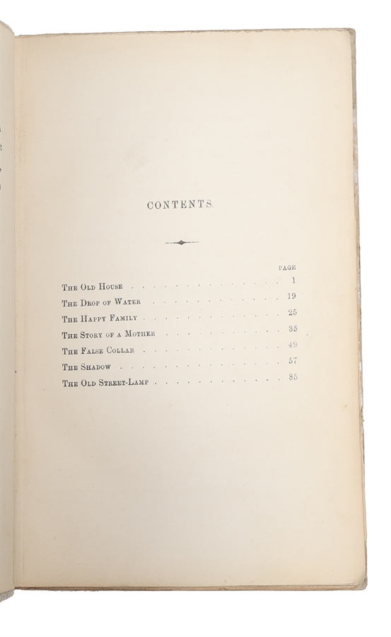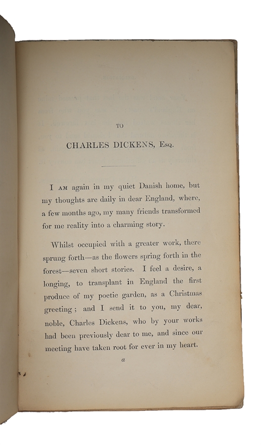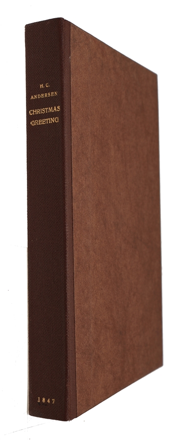 The rare first printing of Andersen's 'Christmas Greeting'. Upon his visit to England in 1847, Andersen issued the present publication to express his gratitude towards his English friends. In the short preface, addressed to Charles Dickens, Andersen states that he produced seven short stories during his visit (five of which were printed here for the first time): "Whilst occupied with a greater work, there sprung forth - as the flowers spring forth in the forest - seven short stories." Of the seven short stories contained in the volume, the following appear here for the first time: "The Old House" ("Det gamle Huus"), "The Drop of Water" ("Vanddraaben"), "The Happy Family" ("Den lykkelige Familie"), "The Story of a Mother" ("Historien om en Moder"), "The False Collar" ("Flipperne"). The present copy belonged to the Danish writer Elias Bredsdorff (1912-2002), Reader in Scandinavian Studies at the University of Cambridge. Bredsdorff passed on the copy to the renowned Andersen collector Erik Dal.