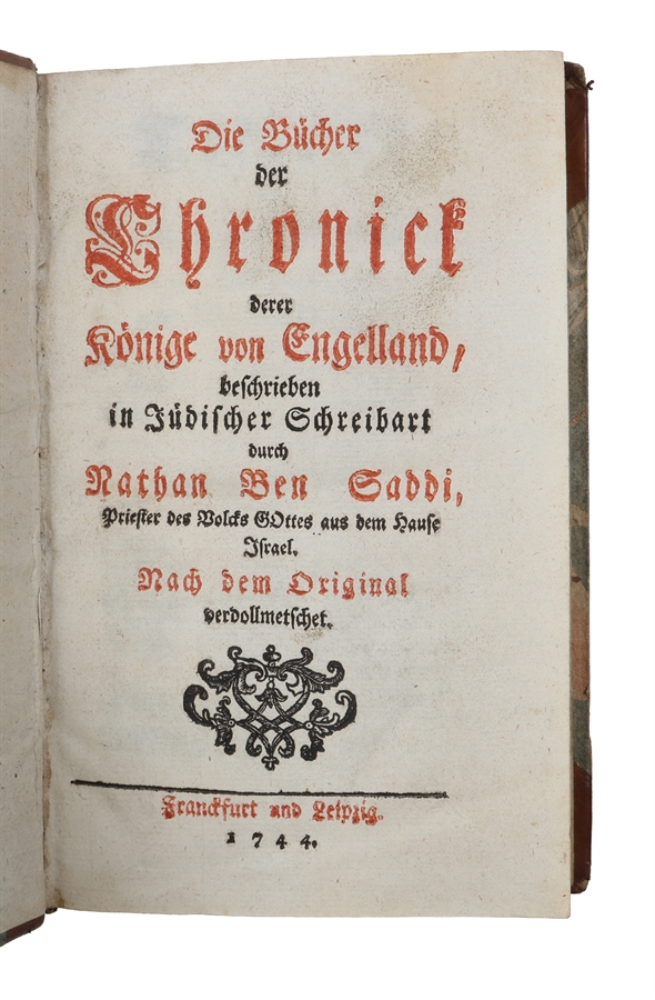 A rare sammelband containing six German “Ben Saddi” chronicles, beginning with the very rare first German translation of Robert Dodsley’s ”The Chronicle of the Kings of England” (London, 1740). Written under the pseudonym Nathan Ben Saddi the work recounts the history of the English monarchy from 1066 to 1603 in the style of the King James Version of the Pentateuch. It was both a literary satire and a commentary on monarchy and politics.