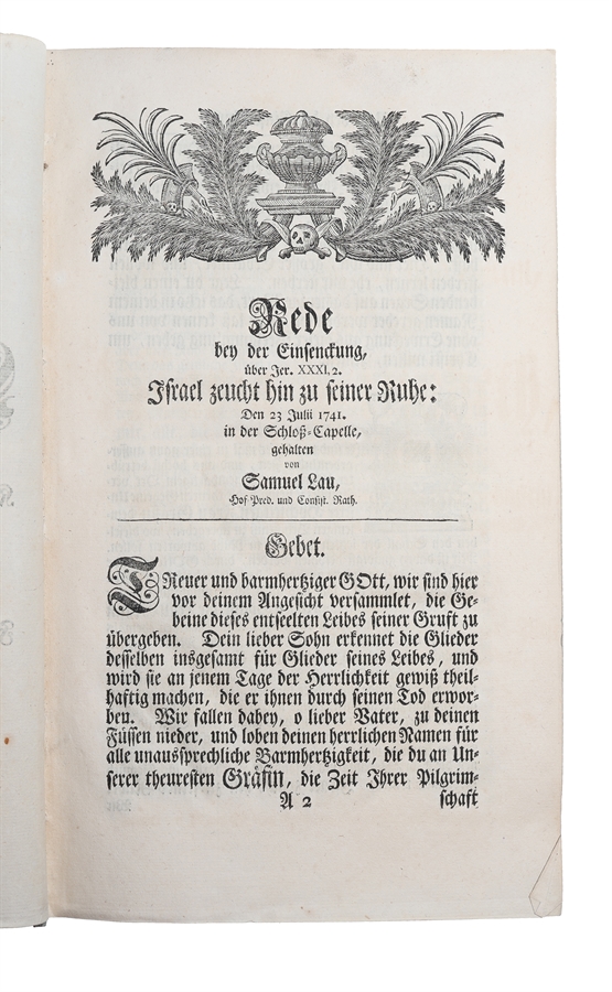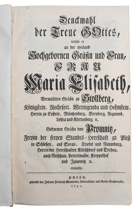 First edition of these funeral sermons to Marie Elisabeth vonPromnitz (1717-1741 Marie Elizabeth (24 October 1717 – 20 July 1741), married Henry Ernest of Stolberg-Wernigerode (1716–78)