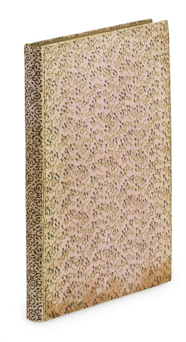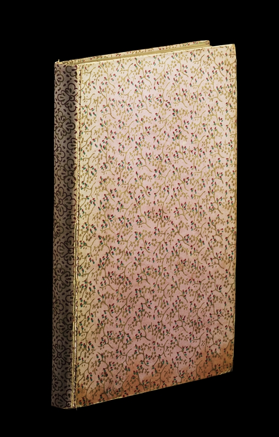 Small 8vo. 157 pp. Splendidly bound in beautiful patterned pink moiré-paper covered with red and green floriated gilt branches. Rebacked in nearly matching paper. Blue silk end-papers. All edges gilt. Printed on thick vellum-paper. A splendid copy with light edgewear and absolutely minimal brownspotting.