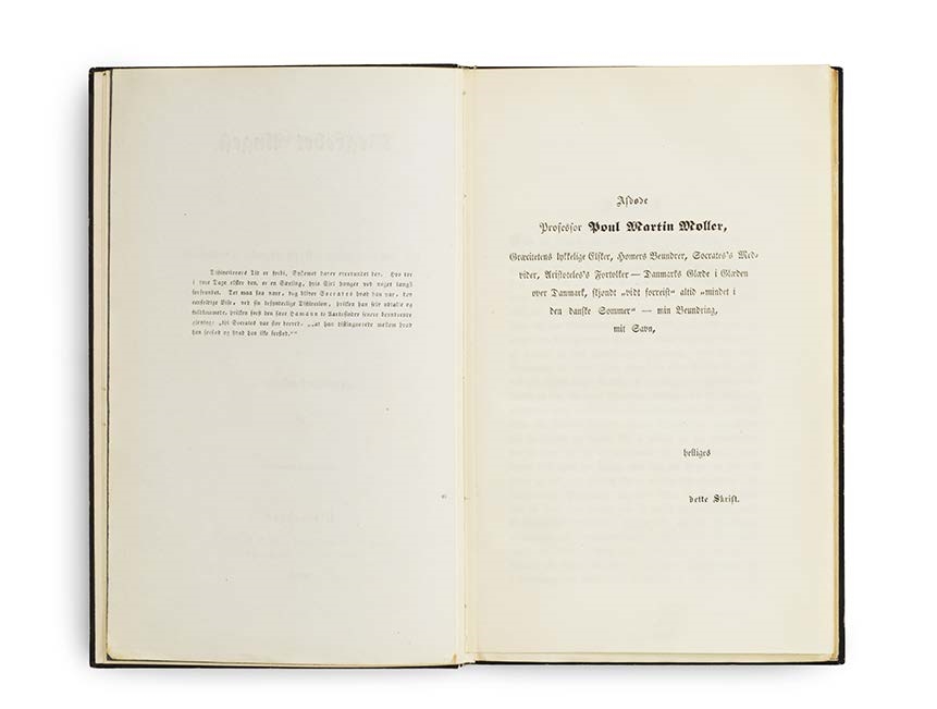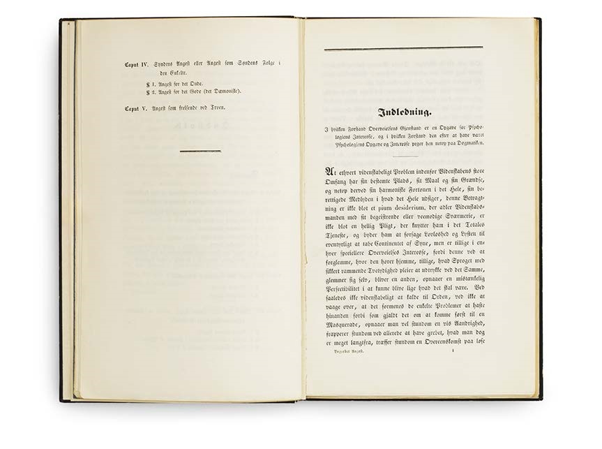 A unique copy of the scarce first edition of this classic of Existentialism, being the only known copy printed on fine paper. The Concept of Anxiety is one of Kierkgaard's greatest works, his primary psychological work, and the work with which "Angst" is introduced in philosophy. It is futhermore (together with Sixteen Unbuilding Discourses - the amputated Eighteen Upbuilding Discourses), the rarest of Kierkegaard's works, at is was printed in half as many copies as his other works. Not a single presentation-copy of the work is known to exist, no copy on special paper has been registered (before this), and merely a single copy of the work is listed in the auction catalogue of Kierkegaard’s books sold after he died (the whereabouts of this copy unknown). This could possibly be the hitherto unlocated copy from Kierkegaard’s own collection. Or it could be a copy he gave away, the only one to have ever surfaced. It is undoubtedly one or the other, seeing that it is on special vellumpaper, on which Kierkegard only had copies made for himself, for presentation, or for Regine. It is this classic of Existentialism that introduced the notion of “Angst” (anxiety) in philosophy. If Kierkegaard had written nothing else, The Concept of Anxiety alone would have cemented him as one of the most important thinkers since antiquity. Nowhere else can one find an account of the concept of anxiety that comes close in importance to the one Kierkegaard gives in the present work. Using the Fall in the Garden of Eden as the foundation of the analysis, he succeeds in describing what no-one has been able to before or since. “Long before modern psychology had entered puberty, Kierkegaard unfurled advanced psychological concepts that in many senses were Freudian before Freud was around. In his primary psychological work, The Concept of Anxiety, he presents his detailed analyses of the relationship of anxiety to phenomena such as freedom, sexuality, original sin, and history.” (The Søren Kierkegaard Research Centre). Being one of his most important and influential philosophical works, The Concept of Anxiety is essential to all later existentialist writers. It was arguably this work that more than any other influenced Existentialism. The work bears a printed dedication to his beloved Poul Martin Møller, one of the most beautiful and moving dedications in a philosophical work. Poul Martin Møller was his philosophy professor, but more than that he was a moral mentor and one of a few people that Kierkegaard truly admired and cared for. Poul Martin Møller died in 1838, leaving almost no published works behind; he is the only person outside of Kierkegaard’s immediate family (here including Regine), who had been honoured with a printed dedication in any of his books. Apart from the title Sixteen Upbuilding Discourses (the amputated Eighteen Upbuilding Discourses – without the two that were quickly sold out), The Concept of Anxiety is by far the scarcest of Kierkegaard’s works – “The Concept of Anxiety was only printed in 250 copies!” (Textspejle, p. 58, translated from Danish), which is ca half of most of the other works. It is, interestingly, the only one of the pseudonymous writings from the period that was reprinted, despite the poor sales numbers of the first issue. In the summer of 1847, when Reitzel buys the remainders of the first issue, a mere 165 copies of what is arguably now considered Kierkegaard’s most important work had been sold. The Concept of Anxiety is not only notorious for its pivotal importance in the history of philosophy and for essentially being the theoretical foundation of Existentialism; among Kierkegaard collectors and bibliophiles in general, it is also notorious for its scarcity, having been printed in a mere ca 250 copies. Furthermore, like Fear and Trembling, not a single presentation-copy of the work is known to exist, nor had any copy printed on special paper ever been discovered (until now). A single copy of the work is listed in the auction catalogue of Kierkegaard’s books sold after he died. But the whereabouts of this copy is unknown (possibly until now). Himmelstrup 62.