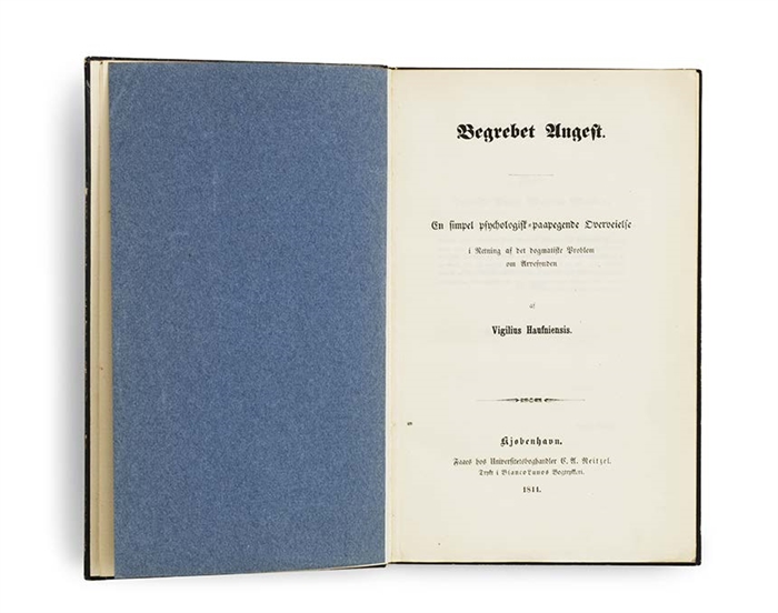 The copy is on fine, bright white vellum-paper (!), uncut, and bound with the original back-strip with the original printed title-label, preserving all of the printed text and with blank blue wrappers of the exact same paper as the back-strip. To our knowledge, The Concept of Anxiety did not appear in blue blank wrappers. It did, however, appear in the characteristic blue paper binding. The wrappers here bound in, however, do not match this paper exactly.