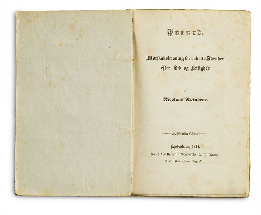 First edition of Kierkegaard's most humorous book, Prefaces, in the very rare original blue binding in truly magnificent state and with the printed title-label preserved in its entirety. Published simultaneously with The Concept of Anxiety, Prefaces can be viewed as its companion piece. It represents an altogether different genre and is the most humorous of all of Kierkegaard’s works, but the two fictional authors of the works interestingly contrast each other. Although having been eclipsed by the now notoriously famous Concept of Anxiety, Prefaces was in fact more popular when it appeared and sold many more copies. Written under the pseudonym of Nicolaus Notabene, the “author” name indicates that despite its humorous approach, Prefaces is still something serious – something to be noted. And it certainly is. It is here that we find Kierkegaard’s sarcastic roasting of the Hegelian system and of the Danish Hegelians with Johan Ludvig Heiberg as the main representant. Through Notabene, he makes fun of Heiberg and Hegel, who both want to explain everything and want to be mediators of understanding. Just as Hafniensis in The Concept on Anxiety poses that “how sin came into the world each man understands solely by himself. If he would learn it from another, he would misunderstand it” (p. 51), so Notabene in Prefaces states that “My frame, my health, my entire constitution do not lend themselves to mediation” (p. 45). In Prefaces we also find Kierkegaard’s thoughts about the relationship between the reading public and the author and his fierce criticism of literary critics and reviewers, among these also Heiberg as well as Martensen, who famously reviewed Either-Or and Repetition respectively. And in the very amusing preface to the Prefaces, we are given another glimpse into Kierkegaard’s thoughts on marriage and the dilemma he found himself in with Regine – the inner struggle between he, who is the husband, and he, who is the author; can one be both? With its challenging notions on the idea of the book and the interaction of the book with its readers, his little ironic masterpiece is a clear forerunner of Postmodernism. “Kierkegaard’s ‘Prefaces’ is a brief though not unimportant work. Themes he develops elsewhere at greater length here are presented with characteristic insight and wit. This richly suggestive text has never received the attention it deserves. William McDonald’s fine translation now makes it possible to assess the importance of ‘Prefaces’ for Kierkegaard’s œuvre and to appreciate its significance for philosophical, literary, and theological issues that are still with us.” (From the review of William McDonald’s 1989 edition of Prefaces in English in the Kierkegaard and Postmodernism-series). Written under a pseudonym and without Kierkegaard’s name appearing as publisher or indeed as anything else, he was unable to give away presentation-copies of the work (due to his own strict set of rules for this). Thus, not a single presentation copy of the work exists. A single copy of the book was in the auction catalogue of his book collection after his death. Himmelstrup 70. The present copy is no. 28 in Girsel's "Kierkegaard" (The Catalogue) which can be found here.
