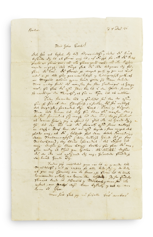 A lengthy and truly magnificent original handwritten letter from Kierkegaard to his nephew Carl Lund, written during Kierkegaard’s first stay in Berlin right after the termination of his engagement to Regine. Original letters by Kierkegaard are of the utmost scarcity and only eight are known on private hands. Having broken off his engagement (see more about Regine and the engagement below, after Section II in vol. II), Kierkegaard almost immediately flees Copenhagen and the scandal surrounding the broken engagement. He leaves for Berlin, the first of his four stays there, clearly tortured by his decision, but also intent on not being able to go through with the engagement. This, his first stay in Berlin, is one of legend. It is a determining factor for his life as an author, with Regine as the inevitable and constant backdrop. It is here that it all really begins. It is here he begins writing Either-Or, parts of which can be read as an almost autobiographical rendering of his failed engagement. Kierkegaard left for Berlin on October 25th, 1841 and returned on March 6th, 1842, with large parts of the manuscript for Either-Or in his suitcase. We have the young existentialist genius in the making, broken and awoken by a self-torturing decision to leave his only beloved, spending four and a half months in a foreign city having fled a horrifying scandal in his hometown and finding himself as an author. This is possibly one of the most interesting and moving periods in Kierkegaard’s personal life, and holding in one’s hand a letter from him from this period cannot but move the heart of any Kierkegaard enthusiast.