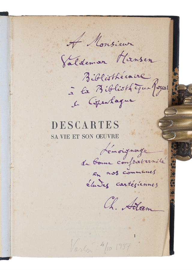 8vo. With the original front wrapper in a contemporary half calf binding. Gilt title to spine. Exlibris to inside of front board. Inscribed by the author to the prominent Danish librarian Valdemar Hansen to half title. A few marginal notes and underlinings in pencil. Frontispiece portrait of Descartes. 178 p.