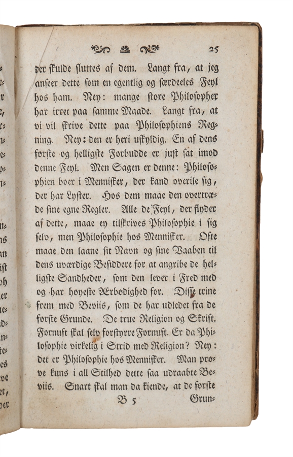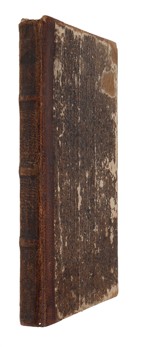 8vo. Samtidigt halvlæderbind over træpermer. Tre ophøjede bind på ryg. Øvre kapitæl bortslidt. Rifter i overtrækspapiret og slid ved kanter af permer. Adskillige tilskrifter og ejernavne på forsats og titelblad. Blad B3 (pp. 21-22) udrevet, men indlagt i nyere faksimile. Spredte brunpletter. 184 p.