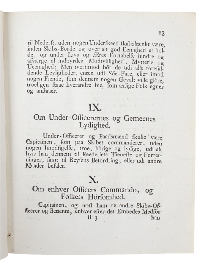 Extremely rare first edition of the official Danish naval and merchant marine code of conduct - laying out the articles of agreement for both officers and common sailors engaged in long-distance trading voyages, especially to colonial outposts in the West Indies, Guinea, the Mediterranean – in this particular case dated 8 December 1780, officially certifying that these “Kongelige allernaadigste Skibs-Articler” were read aloud to the crew of the frigate by its commanding officer, Captain Diderich von Holsten, prior to departure for Tranquebar (the Danish colony in India). The certification notes the ship's weapons (138 cannon) and states that the crew had acknowledged the articles and promised to observe them on the voyage and until the ship's return. The document is signed by Captain Diderich von Holsten and the Waterschout (including his red seal) (from Dutch, “water inspector”), a Danish official, established in 1695, responsible for registering all seafarers departing from Copenhagen on merchant voyages. Documents like these had a very practical purpose and were considered of the utmost importance, and were kept in offcial archives, consequently, they almost never finds their way into the trade. Biblioteca Danica I, 680.