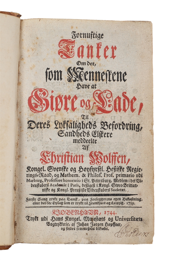 Rare first edition of the first Danish translation of Wolff's 'Vernünfftige Gedancken von der Menschen Thun und Lassen' (Halle, 1720).