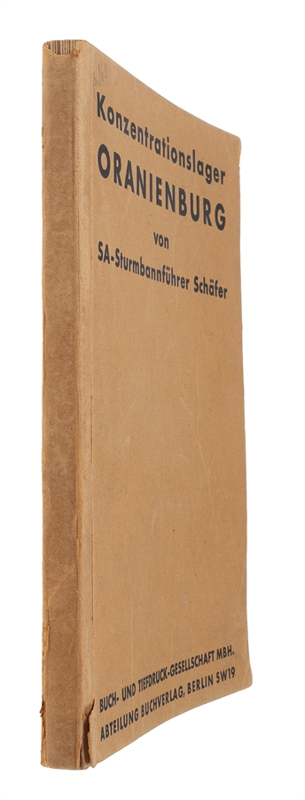 First edition, first printing of this scarce account of the first German concentration camp, a whitewashing apologetic “Anti-Brown-Book”, in which the camp commander attempts to disprove allegations against the camp as “atrocious propaganda”. “The Oranienburg concentration camp was established as one of the first concentration camps on March 21, 1933, overshadowed by the Day of Potsdam. After the “Night of the Long Knives,” the SA-run camp was taken over by the SS in July 1934 and dissolved a little later… Initially SA-Regiment 208 (Standarte 208) established the Oranienburg concentration camp without notifying the responsible authorities in Berlin beforehand. The first inmates were 40 prisoners who were dragged to the small town 20 kilometers (12.4 miles) north of Berlin on the evening of March 21, 1933. The first concentration camp in Prussia was thus situated on the grounds of a former brewery on a main road in Oranienburg. From September 1933, subcamps existed at the Elisenau manor in Blumberg near Bernau and in Börnicke. (https://encyclopedia.ushmm.org/content/en/article/oranienburg-1) “Seger managed to escape in December 1933, fleeing first to Czechoslovakia and later to the United States of America. His book on the terror in Oranienburg was one of the first books written about the conditions in a concentration camp from firsthand experience.” (Holocaust Encyclopaedia) “Only a few days after the establishment of the camp, SA Standartenführer Werner Schulze-Wechsungen transferred control of the camp to the Potsdam district president. Henceforth the camp as well as the guards were paid from tax money. In total, the German tax payer paid 280,000 Reichsmark (RM) between August 1933 and July 1934 to sustain the camp. Internment in the camp was initiated not only by the police and party authorities but also by local administrative authorities. Only because of its location in the town, the camp proved to be a “transparent concentration camp.” The town of Oranienburg had the political prisoners perform communal work. The camp commander, SA-Sturmbannführer Werner Schäfer, compiled an apologetic “Anti-Brown Book” (Anti-Braunbuch), in which he characterized allegations about the Oranienburg concentration camp as “atrocious propaganda.” Repeatedly he invited German and foreign journalists to tour the camp. A radio program “reported” from the concentration camp. The local press wrote extensively about the new institution. Also, movie theaters showed propagandistic About 3,000 prisoners were deprived of their liberty in the Oranienburg concentration camp. The number of prisoners varied considerably. It rose rapidly until August 1933, from 97 to 911, but declined by the end of June 1934 to 271. The prisoners were mostly between the ages of 20 and 40, laborers, unemployed, from Berlin and from the area north of Berlin. Many were taken to Oranienburg after the dissolution of smaller Brandenburg concentration camps (including Alt Daber, Börnicke, Havelberg, and Perleberg) in June and July 1933. Prisoners from the concentration camps in Börgermoor, Lichtenburg, and Sonnenburg were interned at Oranienburg in September and October. Most of the inmates were members of the German Communist Party (KPD), the Social Democratic Party (SPD), and smaller left-wing organizations such as the Socialist Workers’ Party (SAP) and the German Communist Party Opposition (KPO). It is noteworthy that about 50 Jewish youths were also carried off to the camp from a home dedicated to advanced pedagogical ideas that was operated by the German Jewish Community Association (Deutsch-israelitischer Gemeindebund) in Wolzig. They had been abducted because of “Communist activities”.” (Holocaust Encyclopaedia)
