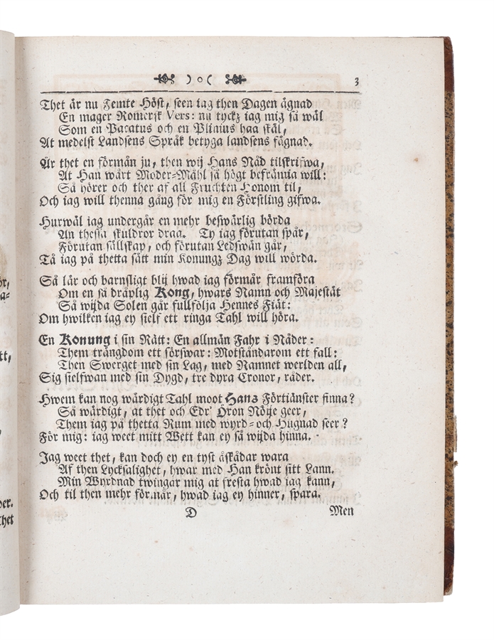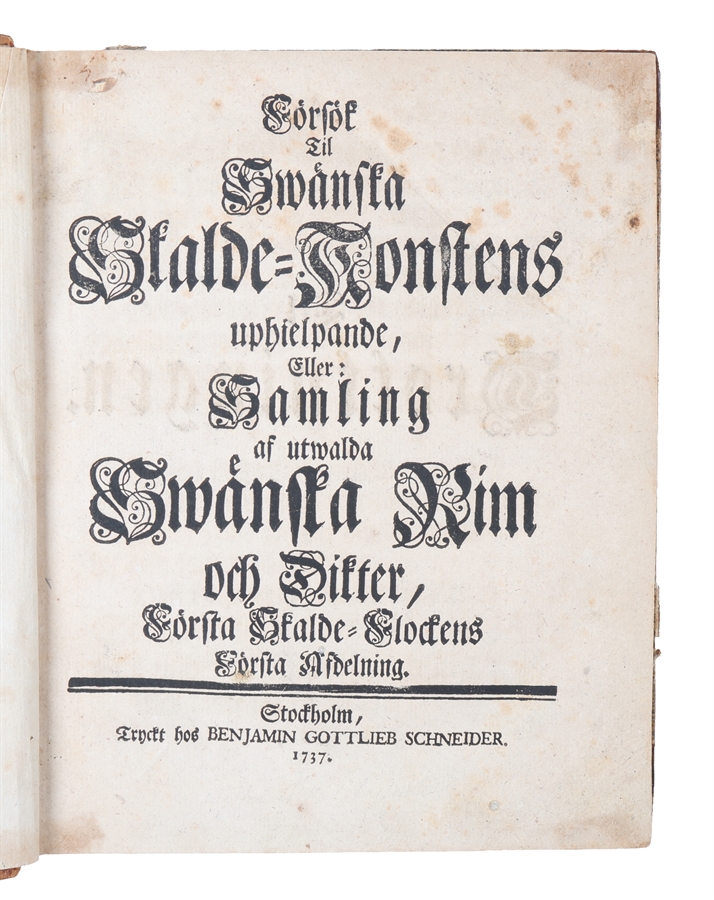 A highly interesting sammelband of numerous rare Swedish occasional and commemorative, literary, political, and ceremonial printings from Sweden’s Age of Liberty (Frihetstiden). Printed in Stockholm by Schneider and Nyström, these rare pamphlets represent multiple genres: funeral orations, royal obsequies, political odes, seasonal and festive verse, literary satire and national poetry anthologies.