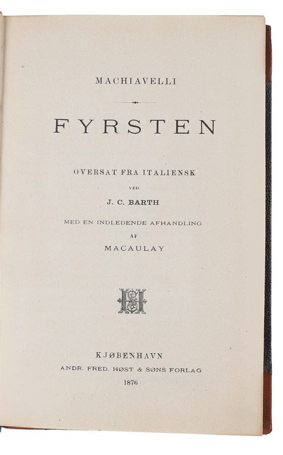 Scarce first edition of the first Danish translation of Machiavelli's monumental "The Prince". "The publication of "The Prince" by Machiavelli had immense and widespread effect throughout Europe and it soon reached the distant Scandinavia, where the work was probably circulating form the first decades of the sixteenth century... "The Prince was not to be translated in Scandinavia until more than two centuries later, partly because in the meantime it could be read in Latin..., but also because at that time a work which established, among other things, the superiority of the Reason State to moral values was unacceptable, at least formally." (de Pol, pp. 248-49). The first Scandinavian translation of the work is the now exceedingly scarce first Swedish translation by Klingenberg from 1757. "Klingenberg's work, however, remained an isolated facxt for more than a century. Actually "The Prince", as a separate work, was translated [into Swedish] only in 1867... By that time the debate over Machiavelli had been settled, and the value of "The Prince" finally acknowledged... The explicit revaluation of "The Prince" in Scandinavia had already taken place during the Romantic Age, thanks to the Danish historian Caspar Peter Paludan-Müller (1805-1882), and particularly to his essay "Undersögelse om Machiavelli som Skribent, især med Hensyn til Bogen om Fyrsten. Et Forsøg i den høiere historiske Kritik." The first Danish translation of the whole work dates back to only 1876 ("Fyrsten. Oversat fra Italiensk ved J.C. Barth. Med en indledende Afhandling af Macaulay" - also important because in the volume it is preceded by a renowned essay 1827 by the English historian Thomas Macauley, from whom, possibly, Paludan-Müller himself partly drew his inspiration." (de Pol, p. 249). In the preface to this first Danish translation, the translator J. C. Barth thanks Casper Paludan-Müller (the author of the first and most significant work about Machiavelli Danish, 1824) for having put at his disposition the explanatory notes that follow the translation. Roberto de Pol: The First Translations of Machiavelli's Prince, 2010).