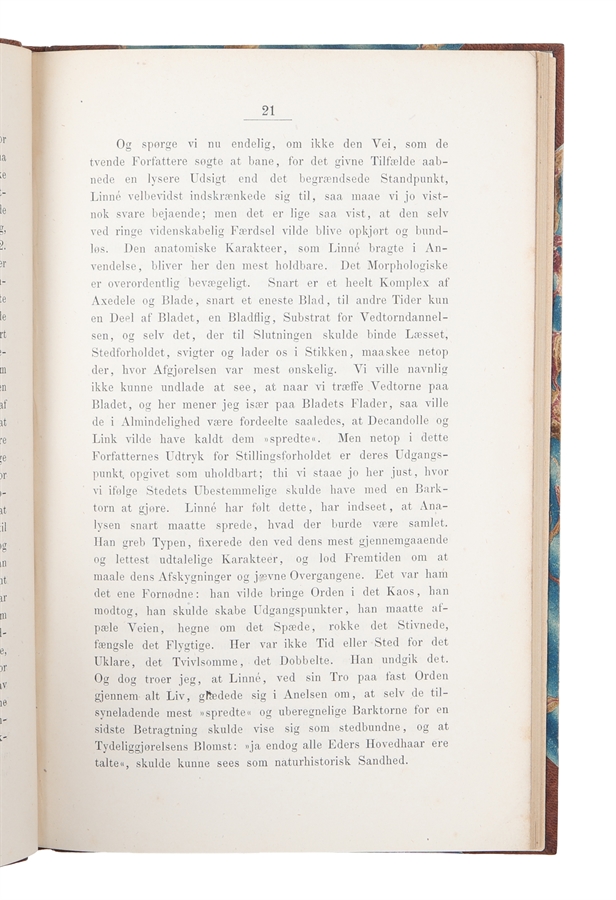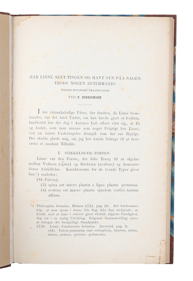 Presentation copy of Didrichsen's critical commentary on Linné. Didrik Ferdinand Didrichsen was a Danish botanist and physicist. He participated as botanist in the first Galathea Expedition. In 1851, he began work as a librarian at the botanical gardens in Copenhagen. From 1856 to 1875 he was an associate professor of botany.