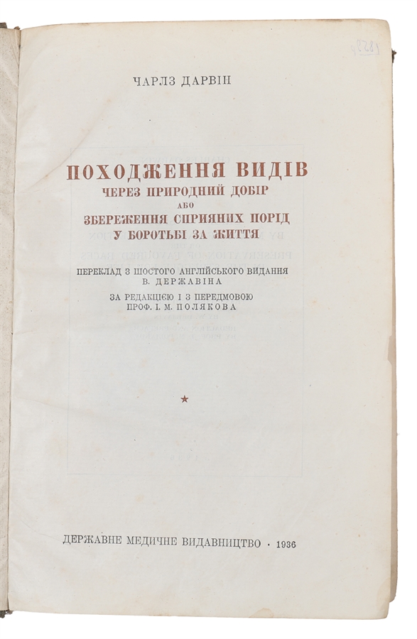 The exceedingly rare first Ukranian translation of Darwin's landmark 'Origin of Species'. OCLC only list two copies (Library of Congress and The Huntington Library, USA) Freeman F797.