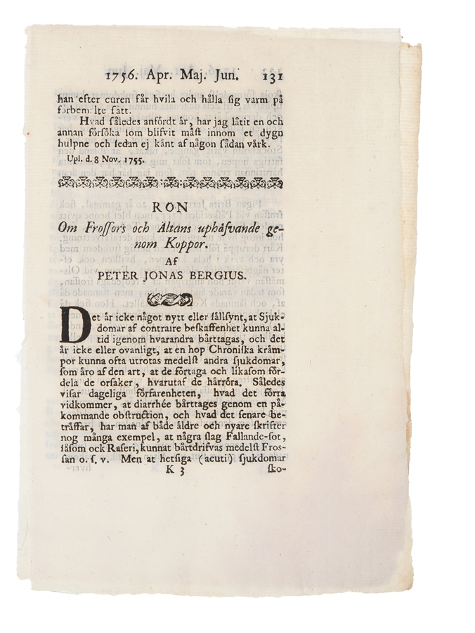 First edition of Bergius' findings concerning the supersession of ague and childhood fever by smallpox - published a year after his dissertation on the same subject. Peter Jonas Bergius (1730 – 1790) was a Swedish medical doctor and botanist. In 1758 Bergius was elected a member of the Royal Swedish Academy of Sciences. In 1768 he was elected to membership of the American Philosophical Society. He was elected a Fellow of the Royal Society in 1770 and a Foreign Honorary Member of the American Academy of Arts and Sciences in 1785.