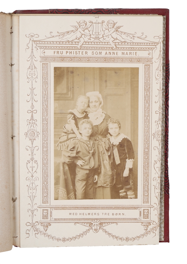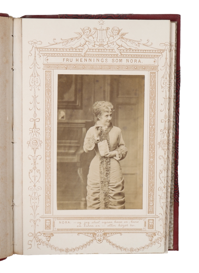 8vo. In contemporary red half calf with four raised bands. Light wear to extremities. Text-leaves with marginal brownspotting. Plates a bit weak in inner margins. 8 ff. + 8 original photographs from the first Danish perfomance of "Et Dukkehjem".
