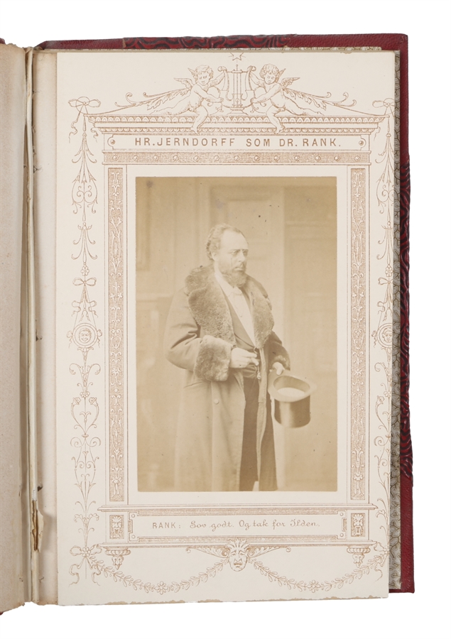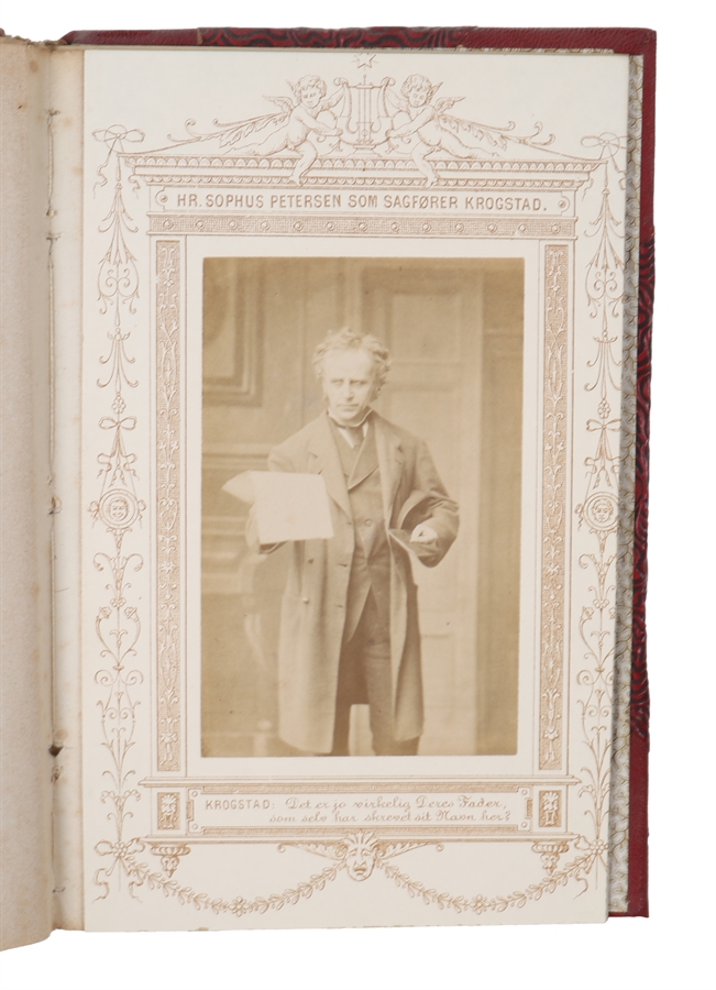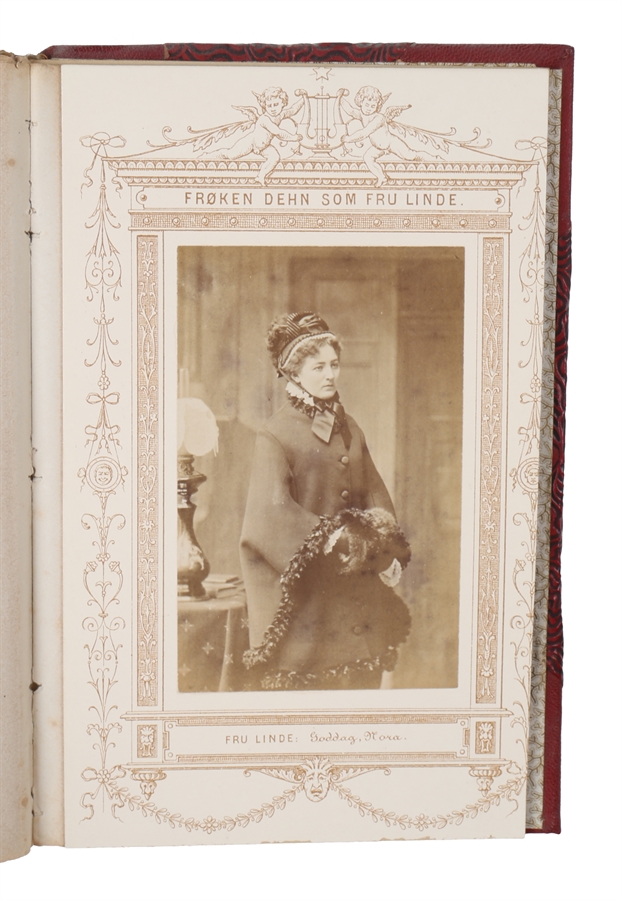 Rare first edition, documenting the historic first staging of Ibsen’s "Et Dukkehjem" at the Royal Danish Theatre in Copenhagen in December 1879. The volume contains eight original photographs of the actors in role, making it one of the earliest attempts at theatrical photography in Denmark, and one of the few surviving contemporary visual records of the play’s groundbreaking early performances. The accompanying text is by Herman Bang (1857–1912), the Danish critic and novelist, whose essay puts Ibsen’s work within the broader cultural and social debates of the period. “Et Dukkehjem” quickly became one of the most influential plays of the modern stage, starting discussions on marriage, gender roles and individual freedom.  OCLC only list three copies.