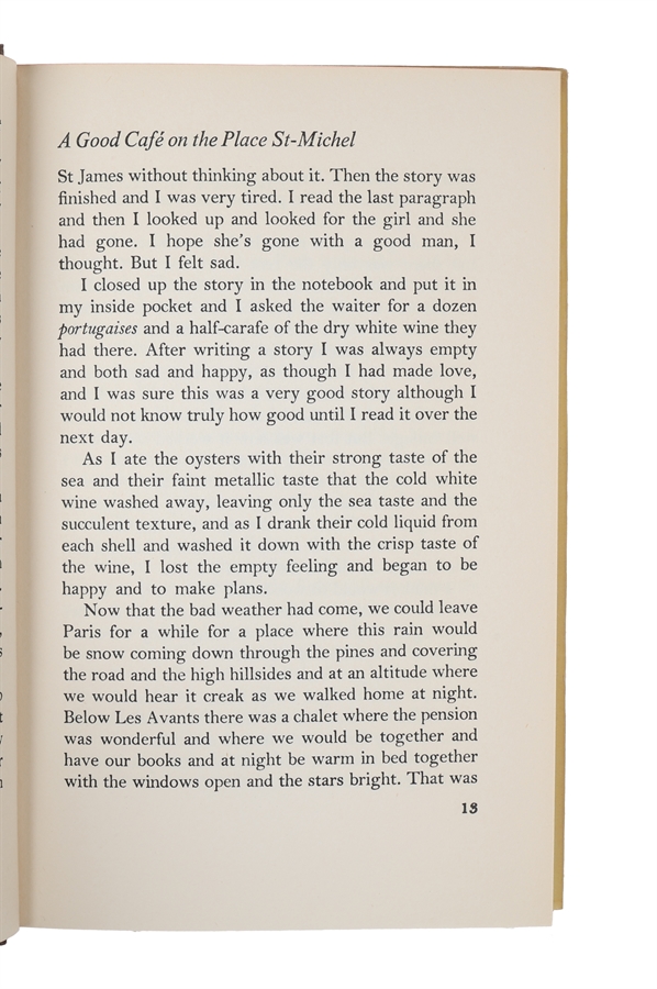 First UK edition of Hemingway’s posthumously published memoir on his years in Paris as a struggling expatriate journalist and during the 1920ies. Here Hemingway describe his first marriage to Hadley Richardson and his relationships with other cultural figures of the Lost Generation in the interwar France. The first edition, compiled from Hemingway’s manuscripts and notes by his fourth wife and widow, Mary Hemingway, was published posthumously in 1964, three years after his suicide. In 2009, a new version titled the “Restored Edition” was released by Hemingway’s grandson, Seán Hemingway, a curator at the Metropolitan Museum of Art. The present work became a bestseller in France following the November 13, 2015 terrorist attacks in Paris. In the context of the attacks, the book's French-language title, “Paris est une fête”, was seen as a symbol of defiance and celebration. Hanneman A 46