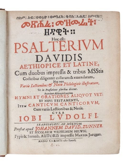 First complete edition of the much celebrated Ethiopic Psalter edited by the great orientalist Hiob Ludolf, the founder of European Ethiopic (Geez) studies. This is the first complete edition of the Book of Psalms printed in Ethiopic characters, accompanied by a Latin translation and extensive philological notes – it is widely regarded as being a high point in Ethiopian studies. “The first printed Ethiopic text (not by accident the psalter, the most commonly read Christian Ethiopic book) dates from 1513, with a second four-language edition in 1518, both edited by Potken in Rome (1513) and Cologne (1518). A few Ethiopic texts were also printed in the seventeenth century, but it was only with Hiob Ludolf (1624–1704) that text editing was carried out in such a way that it can be methodologically evaluated. Ludolf’s edition of the psalter [The present] still stands out as an advanced example of method in some respects: Ludolf based his edition on three manuscripts and the two available prints, and was well aware of questions of normalisation and standardisation. He did not hesitate to reintegrate ex nihilo missing verses or hemistichs when they were attested by the Greek and Hebrew text and missing in the Ethiopic version, where he explained their absence as due to the inaccuracy of the copyist, so that, ultimately, he fundamentally based his edition on his own iudicium (Ludolf 1701, 2v–3v). Hiob Ludolf Hiob Ludolf (1624–1704), also known as Job Leutholf, was a German orientalist, born at Erfurt often referred to as "the most illustrious name in Ethiopic scholarship". While searching in Rome for some documents at the request of the Swedish Court, he became friends with Abba Gorgoryos, a monk from the Ethiopian province of Amhara and acquired from him an intimate knowledge of the Ethiopian language of Amhara. In 1690 he was appointed president of the Collegium Imperiale Historicum. Darlow & Moule 3571.
