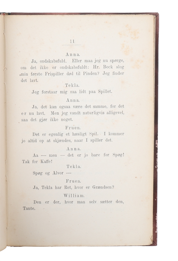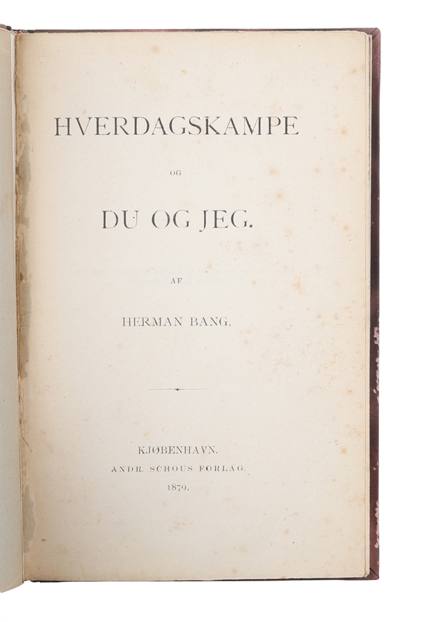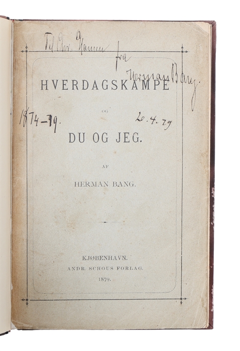 12mo. Indbundet med det originale omslag i et nydeligt nyere halvlæderbind med rygforgyldning. En smule brunplettet. 97,(1) pp. Med dedikation fra Herman Bang på titelbladet: "Til Chr. Hansen / fra / Herman Bang / 20.4.79". Ex-libris påklistret verso af forperm (Poul Sandberg) og verso af foromslag (Rudolf Roussell).
