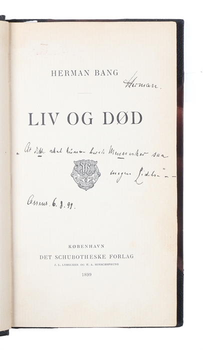 Dedikationseksemplar af Bang's novellesamling Liv og Død. Det er ikke klart, hvem eksemplaret er dedikeret til, men Bang var indlagt på Assens Sygehus fra 30/6 til 26/8-1899, og kan altså være blevet givet til en ansat her.
