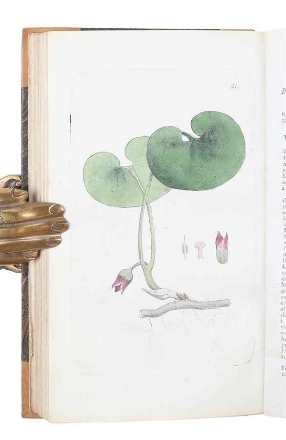 Beautiful set of the first edition of the first Swedish colour-plate book on flowers and plants, often characterized as "The Swedish Sowerby". An 11th (and final) volume was planned to appear later, but as a fire in the printing house (in May 1840) destroyed most of the stock of the last published parts before distribution (54 plates in all), this final unfinished and mostly destroyed 11th volume is hardly ever found together with the 10 volumes that were completed. Lindberg, Swedish Books 1280-1967: 55. Nissen: 2223. Stafleu: 2: 7247. Dal, Med kolorerade figurer: pp. 277-83. Dal, Sveriges zoologiska litteratur: p. 118.