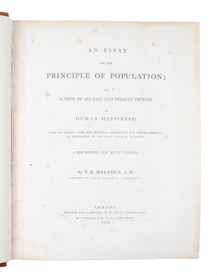The Great Quarto-edition of Malthus' milestone work, the first and most influential book on population. Although being the second edition, after the anonymously printed first of 1798, it is so significantly altered, revised, and expanded that it is considered a new work rather than a new edition. Malthus himself also thought of it as such. It is nearly four times the length of the 1798 essay, the title has been changed (the title of the first: "An Essay on the Principle of Population, as it Affects the Future Improvement of Society with Remarks on the Speculation of Mr. Godwin, M. Condorcet, and Other Writers"), and it is published with Mathus' name as the author, not anonymously. All later editions were minor revisions of this heavily expanded and altered second one. "In the course of this inquiry, I found that much more had been done, than I had been aware of, when I first published the essay. The poverty and misery arising from a too rapid increase of population, had been distinctly seen, and the most violent remedies proposed, so long ago as the times of Plato and Aristotle. And of late years, the subject had been treated in such a manner, by some of the French economists, occasionally by Montesquieu, and, among our own writers, by Dr. Franklin, Sir James Steuart, Mr. Arthur Young, and Mr. Townsend, as to create a natural surprise, that it had not excited more of the publick attention" (Preface to the second edition, p. IV). The controversial views, because of which the work became so influential, are most provocative and eyeopening in the second edition, in which Malthus for instance for the first time advocates moral restraint (meaning sexual abstinence and late marriage) and elaborately explains his comparison between the increase of population and food. "The "Essay" was highly influential in the progress of thought in the early nineteenth-century Europe.... "Parson" Malthus, as Cobbett dubbed him, was for many, a monster and his views were often grossly misinterpreted... But his influence on social policy, whether for good or evil, was considerable. The Malthusian theory of population came at the right time to harden the existing feeling against the Poor Laws and Malthus was a leading spirit behind the Poor Law Amendment Act of 1834." (PMM 251). Thomas Robert Malthus (1766-1834), called the "enfant terrible" of the economists, was an English demographer, statistician and political economist, who is best known for his groundbreaking views on population growth, presented in his "Essays on the Principle of Population", which is based on his own prediction that population would outrun food supply, causing poverty and starvation. Among other things this caused the legislation, which lowered the population of the poor in England. Malthus actually turned political, economic, and social thought upside down with this work, which has caused him to be considered one of the 100 most influential persons in history (Hart, The 100: A Ranking of the most Influential Persons in History, 1978). Malthus was, naturally, condemned by Marx and Engels, and opposed by the socialists universally, but the work had an enormous impact on not only politics, economics, and social sciences, but also on natural sciences. For instance, both Darwin and Wallace considered Malthus a main source in their development of the theory of natural selection, considering him a great philosopher and his Essay on Population one of the most important books ever. "Malthus’s idea of man’s "Struggle for existence" had decisive influence on Charles Darwin and the theory of evolution. Other scientists related this idea to plants and animals which helped to define a piece of the evolutionary puzzle. This struggle for existence of all creatures is the catalyst by which natural selection produces the "survival of the fittest"... Thanks to Malthus, Darwin recognised the significance of intraspecies competition between populations of the same species (e.g. the lamb and the lamb), not just interspecies competition between species (e.g. the lion and the lamb). Malthusian population thinking also explained how an incipient species could become a full-blown species in a very short timeframe." The second edition must be considered the most important of all the editions. This is far more a work on the problems of over-population than it is a response to Godwin and Condorcet on their works (whic is the main concern of the first edition). "Not so much shocked by his own conclusions, in his "Essay on Population" (first ed. 1798), as driven by a naturally inquiring mind, he travelled for three years through Europe gleaning statistics and then published a second edition (1803)." (Catlin, A History of the Political Philosophers, 1939, p. 377). PMM 251 (first edition).
