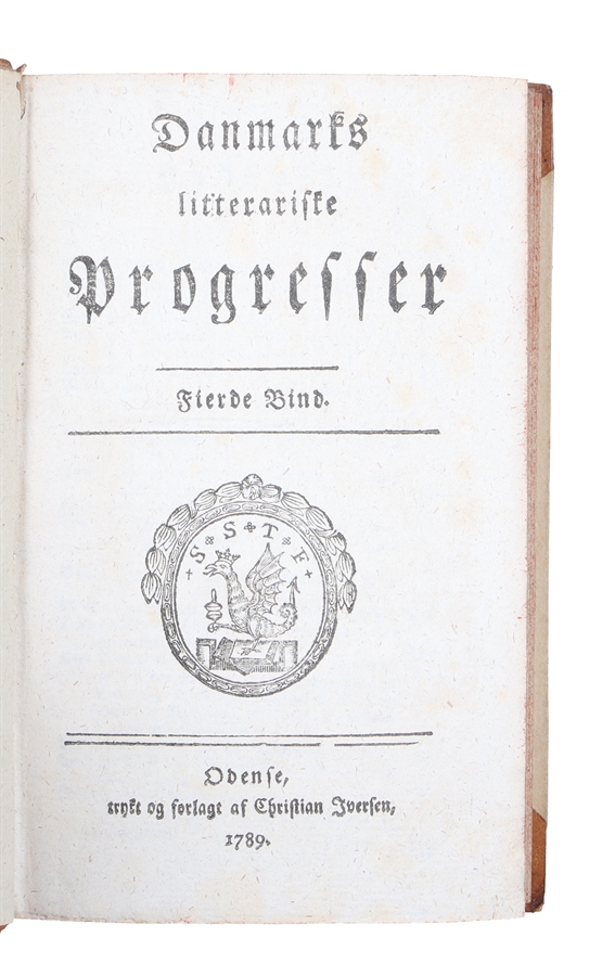 Last volume (volume 4) in "Danmarks litterariske progresser" (“Denmark’s Literary Progresses”), Danish periodical published from 1781 to 1789 edited by F. Dræbye. The journal later changed its name to "Historisk, politisk, satyrisk, poetisk, moralsk" (“Historical, Political, Satirical, Poetic, Moral”) and was issued in a total of four volumes during that period. Biblioteca Danica IV, 537.