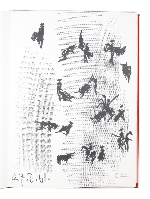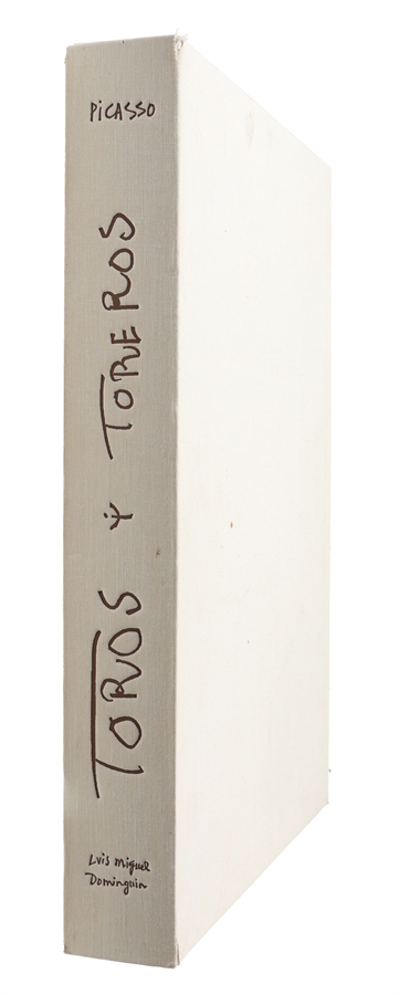 First edition, being one of the 150 numbered copies signed by Picasso, of one of the artist’s greatest books of the post-war period, magnificently printed under Picasso’s supervision and dedicated to his lifelong fascination with bullfighting. Luis Miguel Dominguín, legendary bullfighter whose exploits were described by Hemingway in “The Dangerous Summer”, wote the lengthy introduction. A monumental artist’s book, “Toros y Toreros” stands as both an artistic summary of Picasso’s lifelong fascination with the spectacle of the bullfight and a deeply personal reflection of the people and passions that surrounded him in his final decades. The work is based on Picasso’s sketchbooks from 1959, a period of graphic experimentation at Vallauris, and reflects his deep personal engagement with the bullfighting world and its participants. His old companion Manuel Pallares would visit for long tertulia-style conversations in Catalan, while his wife Jacqueline was more interested in the artist’s publisher, Gustav Gili, and his Andalusian friend, the celebrated bullfighter Luis Miguel Dominguin: “The main involvement [in bullfighting] for Picasso was not so much with the parade and the skill of the participants but with the ancient ceremony of the precarious triumph of man over beast … The man, his obedient ally the horse, and the bull were all victims of an inextricable cycle of life and death.’ (Roland Penrose, Beauty and the Monster, p.170.) The present work unites Picasso’s art with his lifelong fascination for the drama, ritua,l and symbolism of the bullfight, uniting his genius as an artist with one of the most strong passions of his Spanish identity.