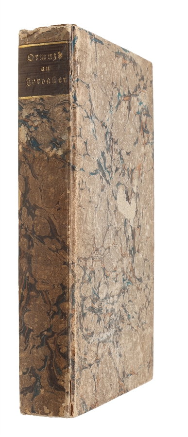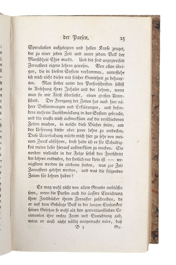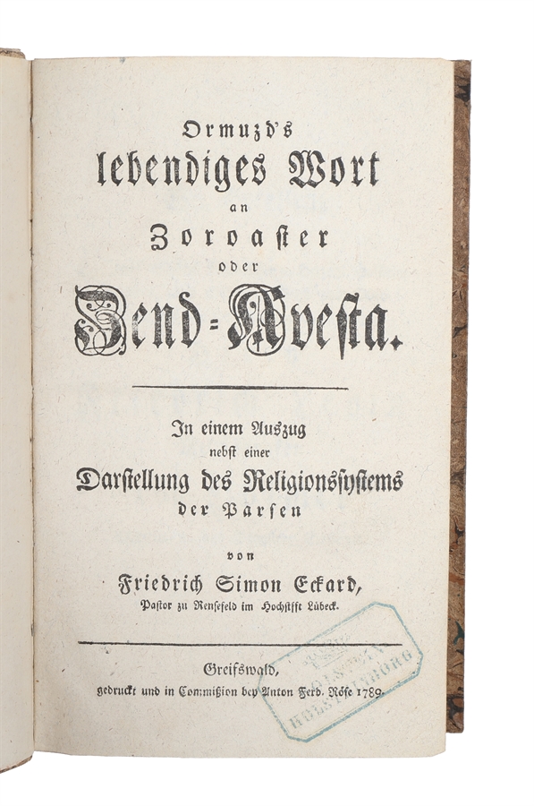 Rare first edition of this early German work on Zoroastrianism representing an extract of the Zend-Avesta together with a systematic exposition of the religious beliefs of the Parsis, a Zoroastrian ethnic group in the Indian subcontinent. Eckard here discusses ritual practice, priesthood, sacred texts, cosmology and ethics, drawing on contemporary European Orientalist scholarship, especially the work of Anquetil-Duperron, whose translation of the Avesta (Zend-Avesta, Ouvrage de Zoroastre, 1771) had only recently introduced these texts to Western readers.