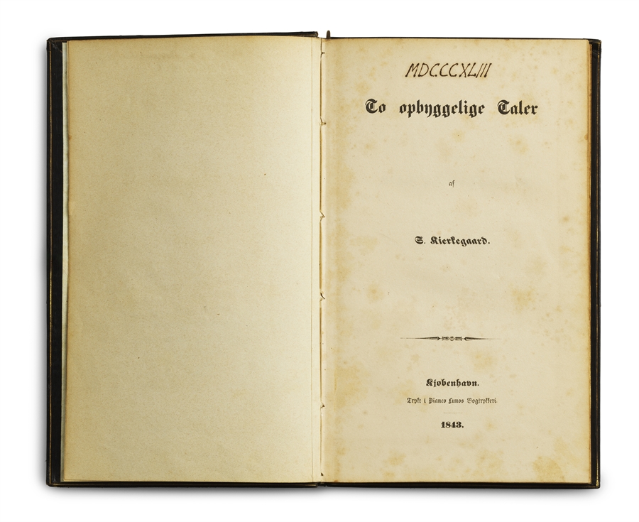 8vo. 52 pp. + 62 pp. + 84 pp. All three publications bound together in an absolutely magnificent full black fine morocco binding with richly gilt ornamental spine with gilt Gothic lettering: Opbyggelige Taler. No. 1-9. White moiré-endpapers. Boards with a single gilt line-frame inside which another gilt frame with ornamental corners. Edges of boards and inner dentelles with gilt single line-ornamentation. All edges gilt. A truly magnificent binding with just minimal wear and no restorations of any kind. Printed on varying paper, one quire being thinner than the rest. Some browning and light brownspotting. Old owner’s names to front fly-leaf and previous owner’s neat pencil annotations to front and back free end-papers, explaining that this is Kierkegaard’s own, personal copy, and the further provenance of it.