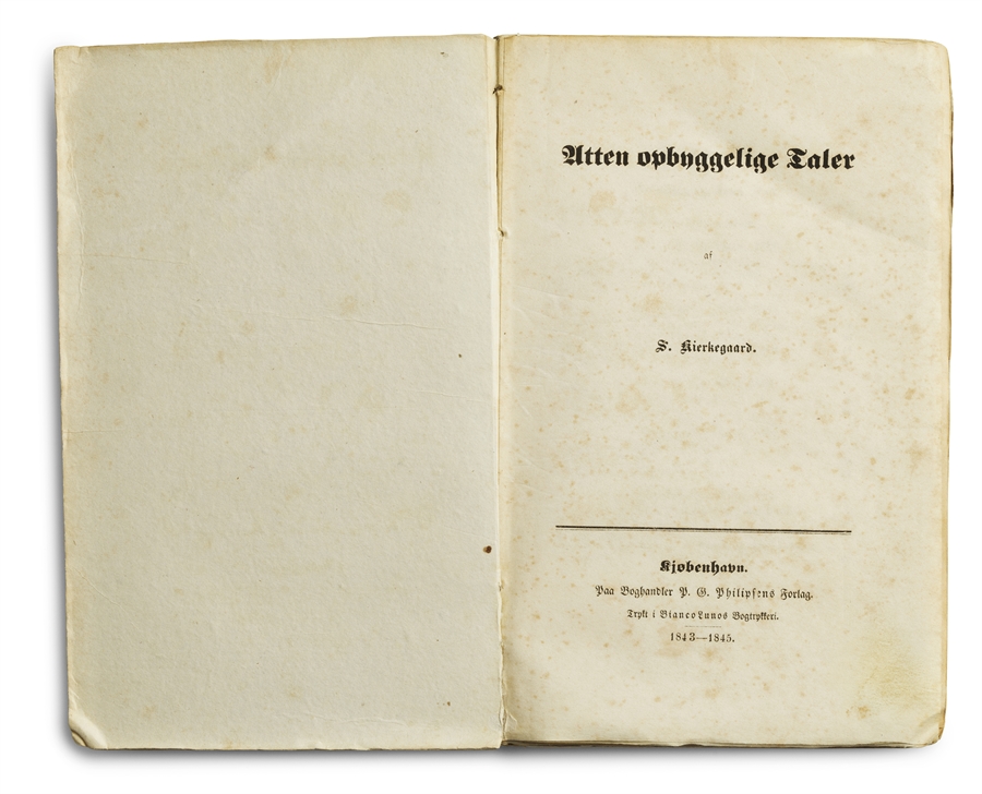 A truly magnificent copy of the first edition of this very scarce Kierkegaard-title, in completely original condition with all of the original printed title-label preserved, and fully complete with the This Kierkegaard-title is rare in itself, with much less than 278 copies printed in all, but it is utterly amazing to find this exceedingly rare book in original state like here. Only very few copies are left in the original binding, which we have only seen once before. The spines of the original Kierkegaard cardboard bindings are always just thin paper directly glued on the block, making them extremely fragile. If one finds these original bindings, the spines are almost always more or less disintegrated. The present copy is a rare exception that furthermore has the original title-label, which is of the utmost scarcity. To our knowledge, only one other copy in the original binding has been located. Apart from the other copy we have seen of this work in the original binding, the present copy is also the only original Kierkegaard-binding we have seen that is not in the usual blue “hollanderet” cardboard binding, but plain brown. No other such copy has been registered for sale, and no other such copy, to our knowledge, is registered in Kierkegaard’s Upbuilding (or Edifying) Discourses were published over the course of two years, in 1843 and 1844. In all, 18 Upbuilding Discourses were published, divided over six publications, namely: Two Upbuilding Discourses from 1843 Three Upbuilding Discourses from 1843 Four Upbuilding Discourses from 1843 Two Upbuilding Discourses from 1844 Three Upbuilding Discourses from 1844 Four Upbuilding Discourses from 1844 Each of these publications accompanied one of the main pseudonymous works, beginning with Either-Or in 1843. As opposed to his major philosophical works, the religious upbuilding discourses actually bear the name of the author on the title-page. Of course, this was by no means incidental. While the pseudonymous works could raise the question of the religiousness of the author, the parallelly written religious discourses stress the fact that we are dealing with an author, who was religious from the very beginning – an essential fact that Kierkegaard wished to stress for those interested in his authorship. In his journals, Kierkegaard clearly states that the religious discourses are as significant in his oeuvre as a whole as are the larger pseudonymous works, “I began with “Either-Or” and two upbuilding discourses...” he says, and explains that he intended the upbuilding, the religious, to advance, and that he wanted to show “that the writer was not an aesthetic author who in the course of time grew older and for that reason became religious”. (Journals, IX A 227). He was religious all along, also during all of the major philosophical publications that were not written in his name. The fact that every major pseudonymous work – up until Concluding Unscientific Postscript appeared and revealed the identity of the real author – was accompanied by one of these small Upbuilding Discourses, bears testament to the pivotal role they play in Kierkegaard’s philosophical development. Furthermore, while Kierkegaard could not present anyone with copies of his pseudonymous works (as explained above), he could indeed give away presentation-copies of his accompanying Upbuilding Discourses, which he then did. The Upbuilding Discourses are particularly interesting in several regards, one being that it is in the course of the printing of these that Kierkegaard changes his publisher. Ever since Kierkegaard had chosen to publish his first book himself, he had had his books on commission with the leading Copenhagen publisher Reitzel (the sole exception being his thesis, the Irony). That was also the case with Two Upbuilding Discourses from 1843. But for some reason, the following five publications of Upbuilding Discourses did not appear with Reitzel, but with P.G. Philipsen instead. We do not know the exact reason for this change in publishers, as the commission was exactly the same for the two. Whereas Two Upbuilding Discourses from 1843 had sold relatively well, the Three and Four Upbuilding Discourses from 1843 did not sell well. A mere 102 and 104 copies respectively out of a commission issue of 300 were sold. In an attempt at making money on these discourses in spite of the poor sales numbers, Philipsen offers to buy the unsold copies of Two Upbuilding Discourses from 1843, buys a sales issue of 300 copies of the Two Upbuilding Discourses from 1844, and makes the same agreement with Kierkegaard for the following two Discourse-publications. Sales numbers are still poor, however, and in the spring of 1845, only ca 100 copies of each of the 1844 Discourse publications have been sold. The printing issue of each was about 500, and Philipsen’s sales issue 300; thus, both Philipsen and Kierkegaard had large numbers of each Discourse-publication left, and in May 1845, they make a new deal. Philipsen buys the remainder issues of all six Discourse-publications, including the 278 copies of Two Upbuilding Discourses from 1843 from Reitzel. Philipsen has a joint title-page printed, along with a contents-leaf, and now issues the seminal Kierkegaard-publication that is no. 85 in the bibliography (Himmelstrup), namely Eighteen Upbuilding Discourses – all six publications, constituting all eighteen Upbuilding Discourses collected in one book. Seeing that there were 278 copies left of the Two Upbuilding Discourses from 1843, a maximum of 278 copies of Eighteen Upbuilding Discourses can have been made, making it one of the scarcest Kierkegaard-books. The actual number is certainly lower than 278, though, probably quite a bit lower, seeing that Philipsen continued to sell the separate publications, all copies of which he then evidently did not include in the Eighteen Upbuilding Discourses. The individual pamphlets, of course, are even scarcer, with a maxi
