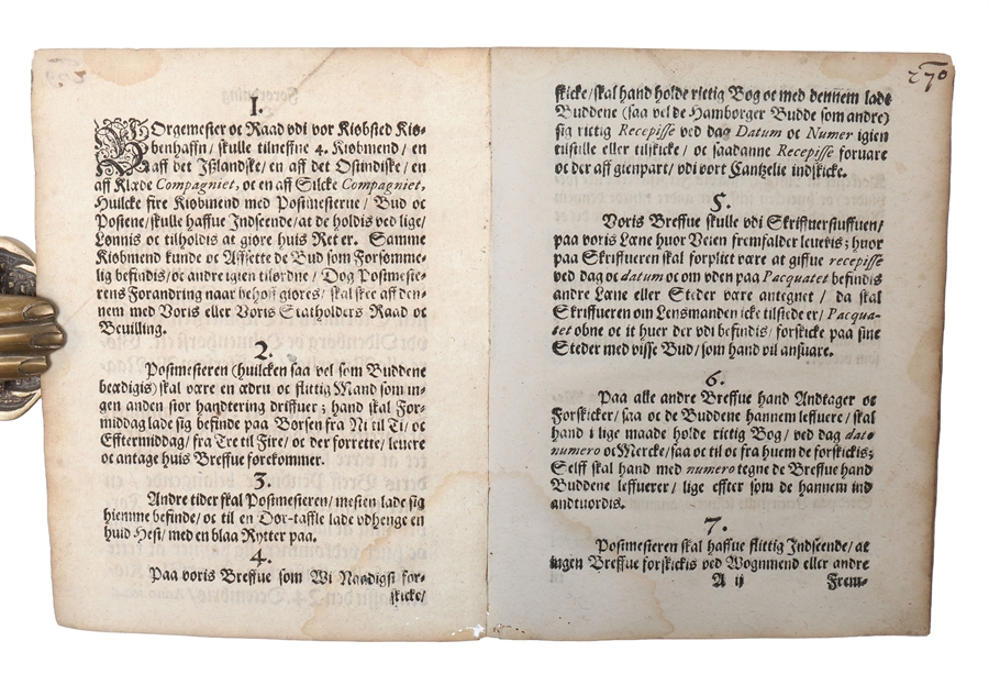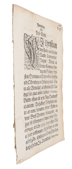 First appearance of this landmark ordinance constituting the birth of the Danish-Norwegian postal system. “In 1624, King Christian IV laid the foundation for what would become Denmark's postal service – kind of a Christmas gift to all Danes, since it was on December 24. Initially, nine postal routes were created, connecting Copenhagen with key towns across the country. This new system introduced a structured method of communication, ensuring timely delivery of letters and parcels in an era when reliable communication was a luxury. For the next four centuries, the postal service became a backbone of society, adapting to Denmark’s growth and modernization. (Postnord, 400 Years of Connecting People: PostNord’s Milestone in Denmark).