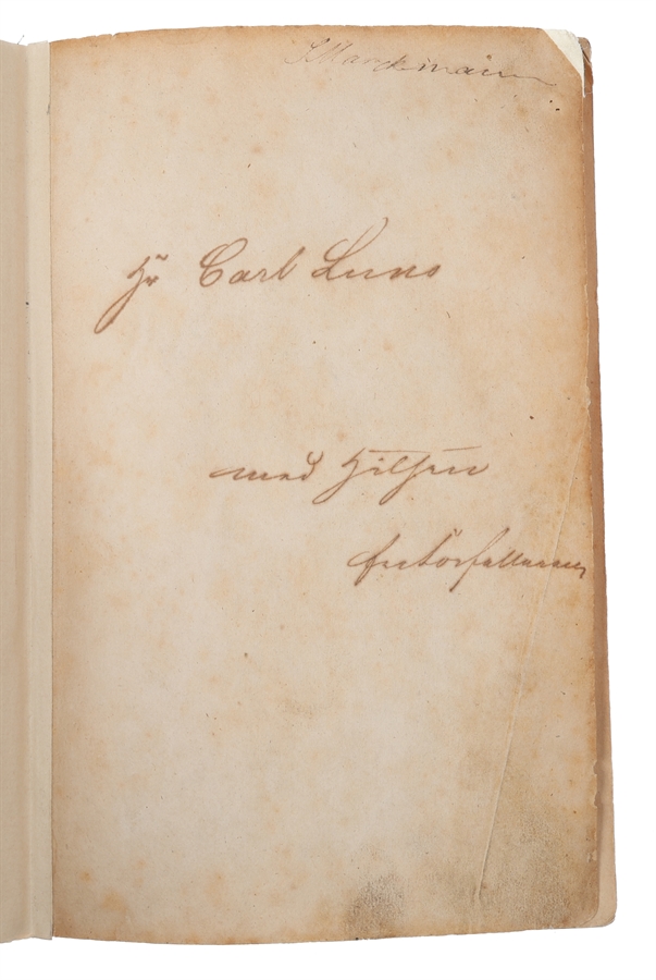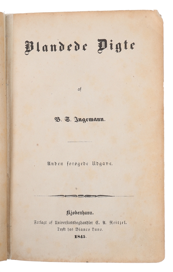 Dedikationseksemplar til Ingemann’s “allerintimeste Ungdomsven” Carl Luno (Schwaneffügel, Ingemanns Liv og Digning, p. 399). Ingemanns forhold til Carl Luno fremstår i begyndelsen som et af de dybeste og mest betydningsfulde venskaber i hans ungdom, et forhold præget af fortrolighed, hjertelighed og gensidig støtte. Han var “en trofast og fordringsløs Ven”. I modsætning til f.eks. H. C. Andersen søgte han ikke prestigefyldte forbindelser, men knyttede sig loyalt til dem, han delte åndeligt fællesskab med. Netop derfor vækker det undren, at han senere afbryder forbindelsen til sin “allerintimeste Ungdomsven Carl Luno”. Luno var den, “der mer end nogen Anden havde været Gjenstand for den tyveaarige Digters varmeste Hjærteudgydelser”, og hos hvem Ingemann fandt “Forstaaelse og Støtte, da tærende Sygdom og svære Sjælsanspændelser truede med at drage ham ned i en tidlig Grav”. Luno var altså ikke blot en ven men en eksistentiel støtte i en sårbar periode. (Schwaneffügel, Ingemanns Liv og Digning, p. 399-402).